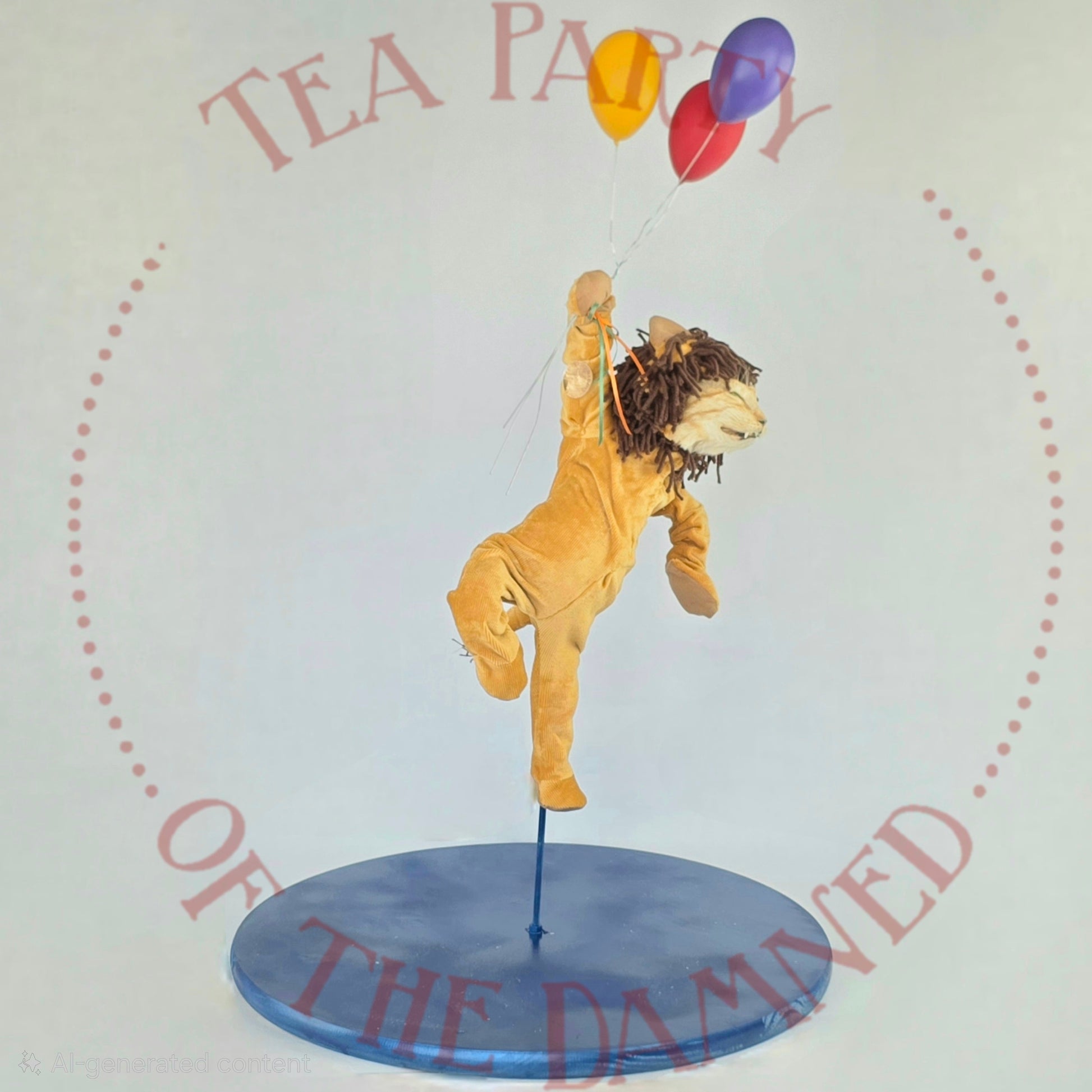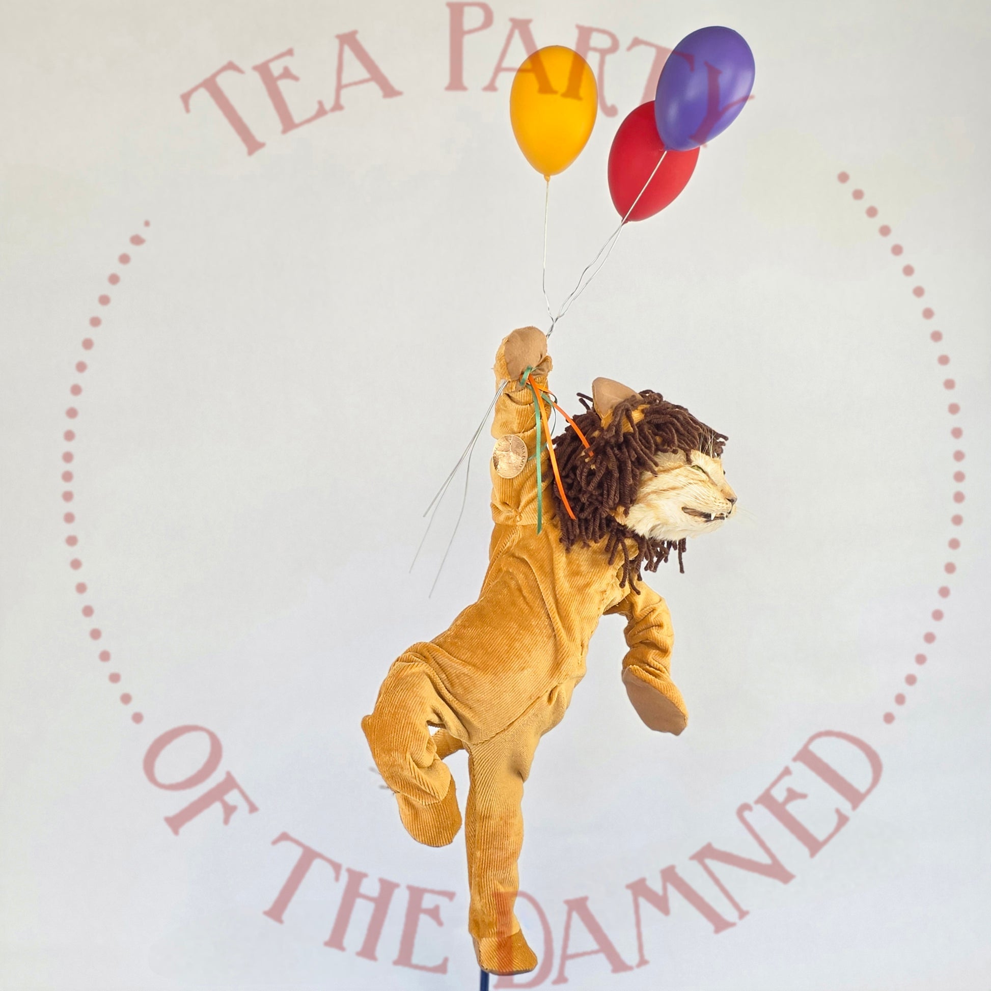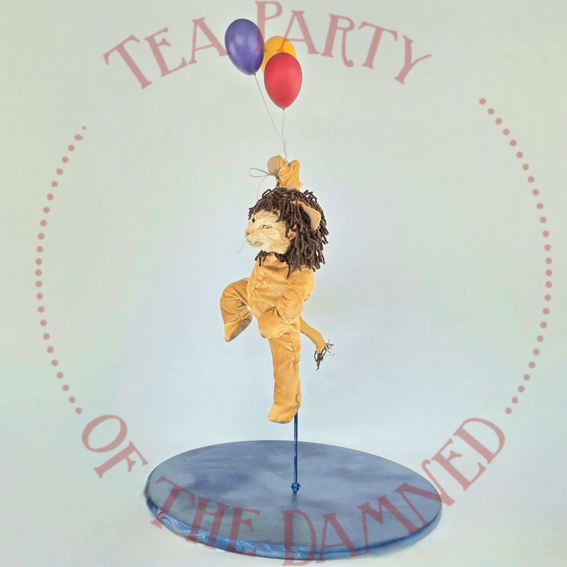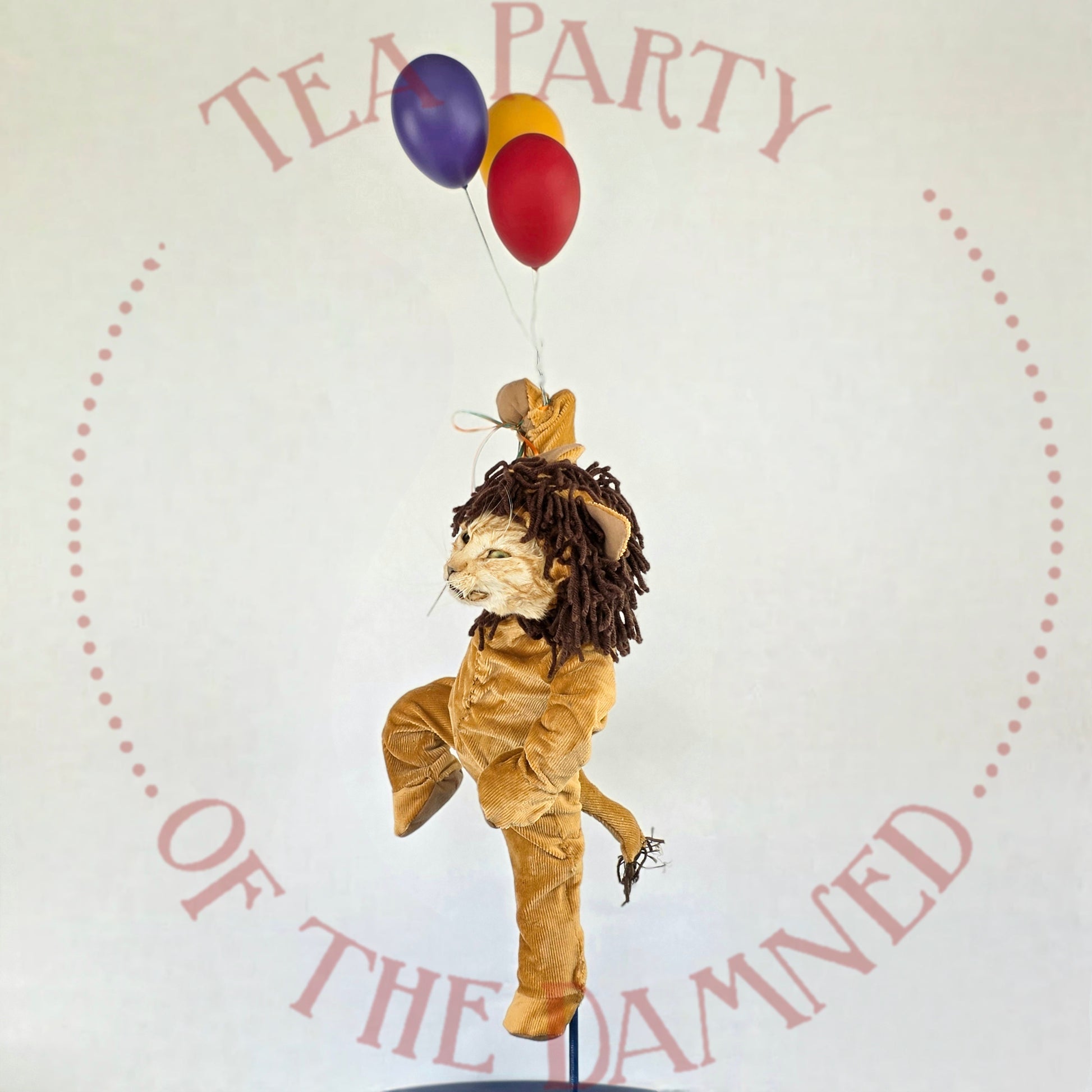 Dressed in a plush feline suit and suspended in mid-air like a furry acrobat who’s late for his own spotlight, he brings a touch of vintage circus charm to any room—minus the popcorn smell.