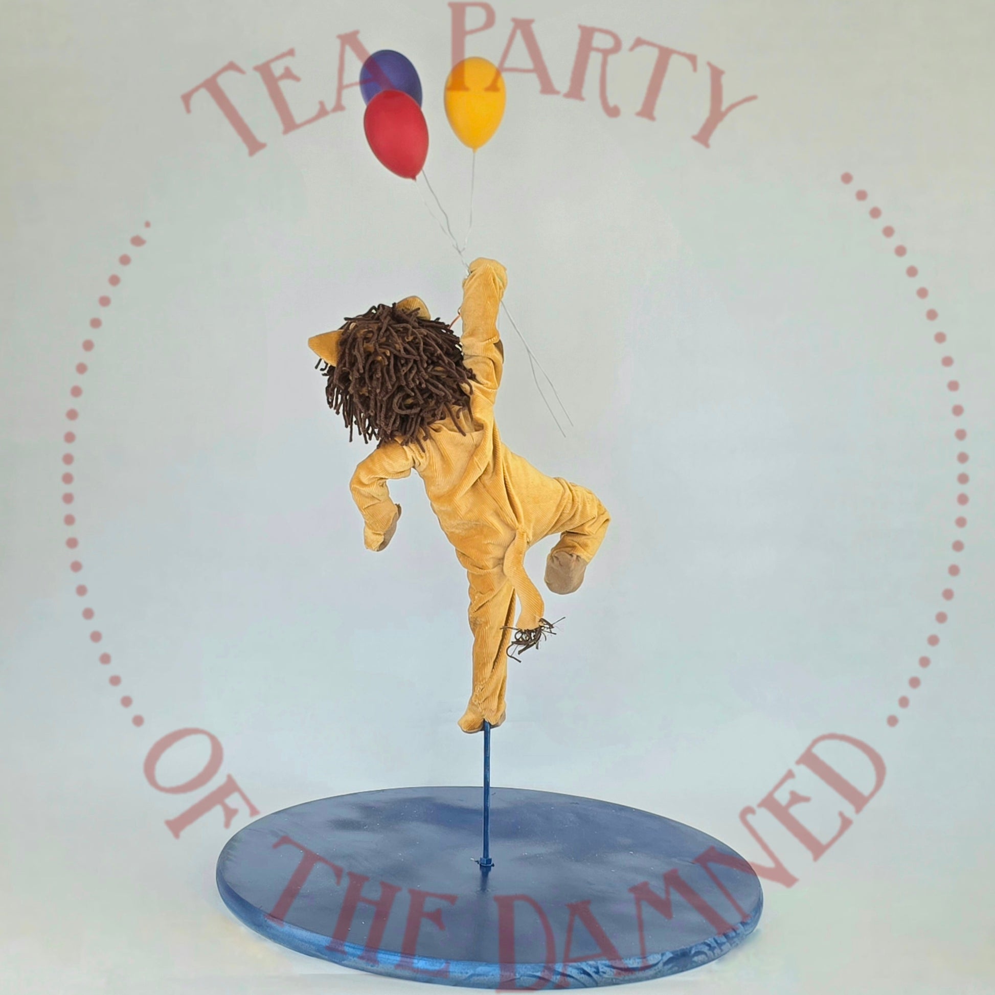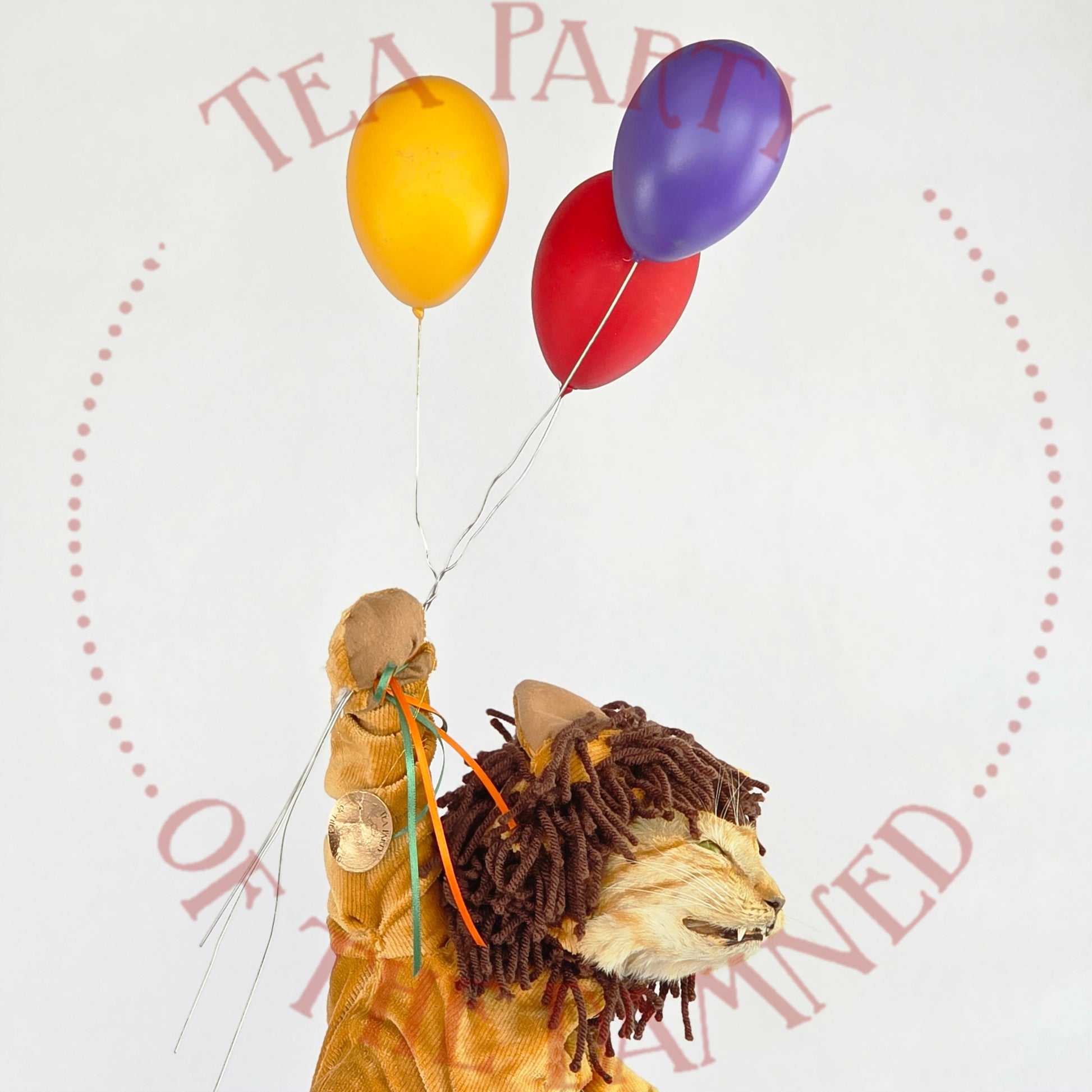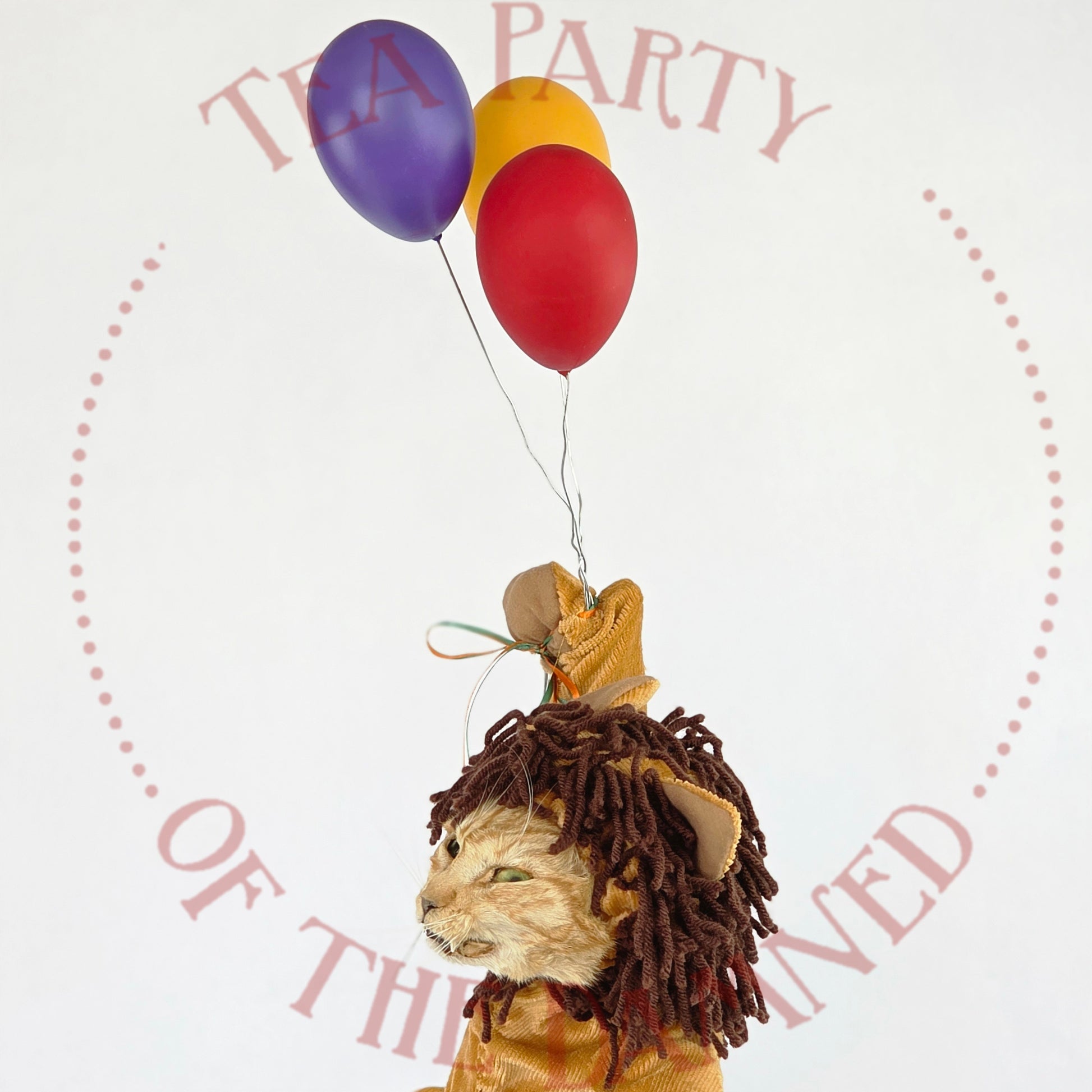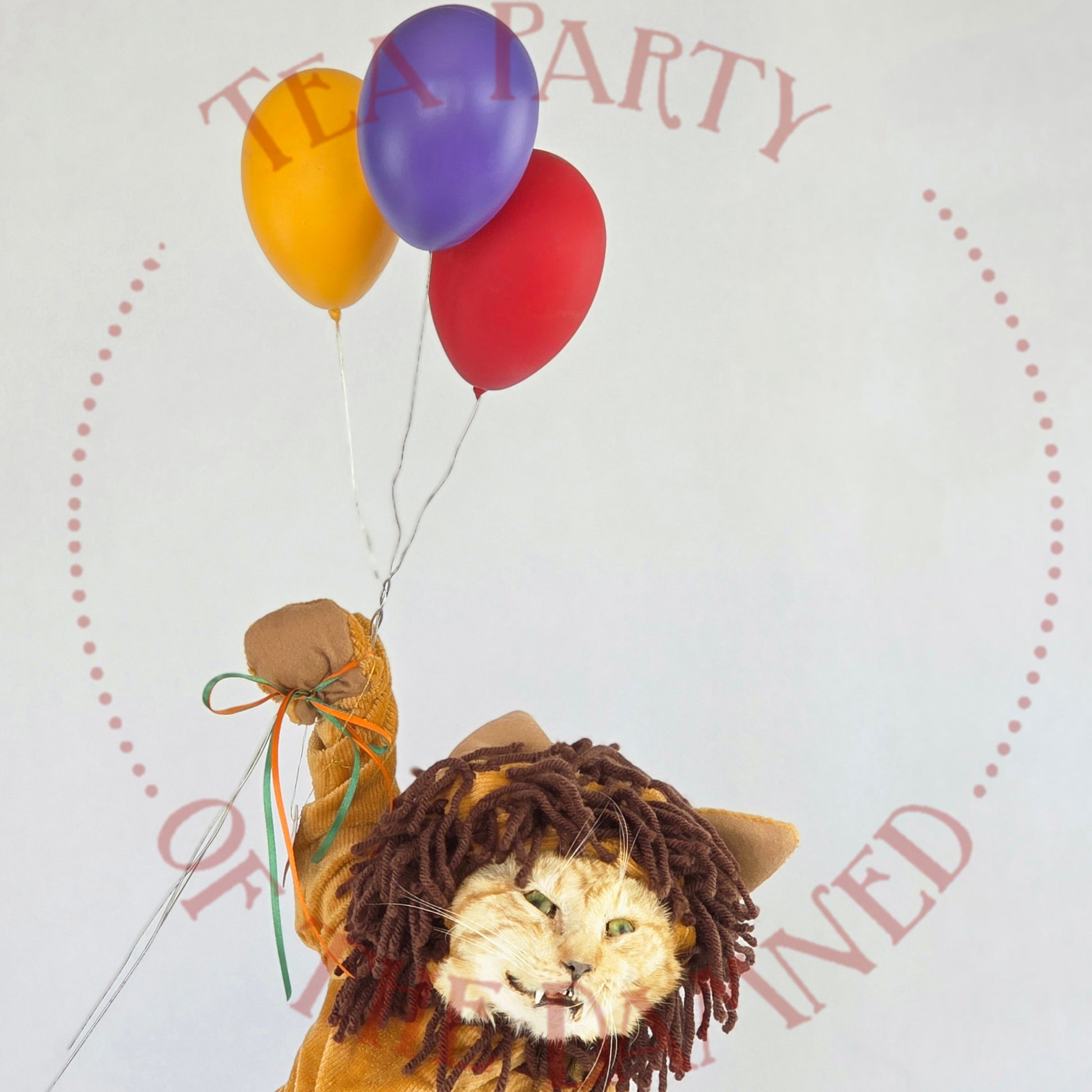 Dressed in a plush feline suit and suspended in mid-air like a furry acrobat who’s late for his own spotlight, he brings a touch of vintage circus charm to any room—minus the popcorn smell.