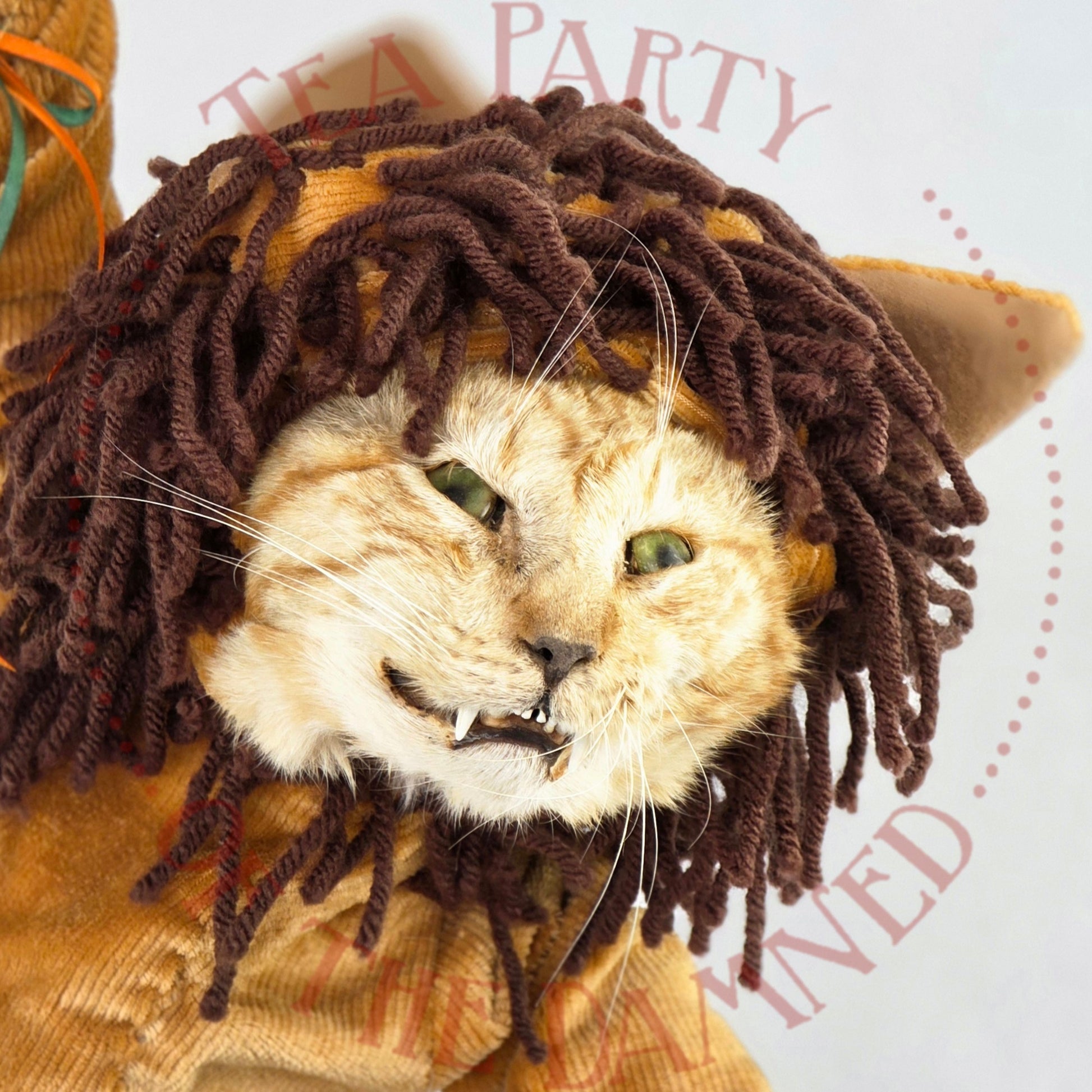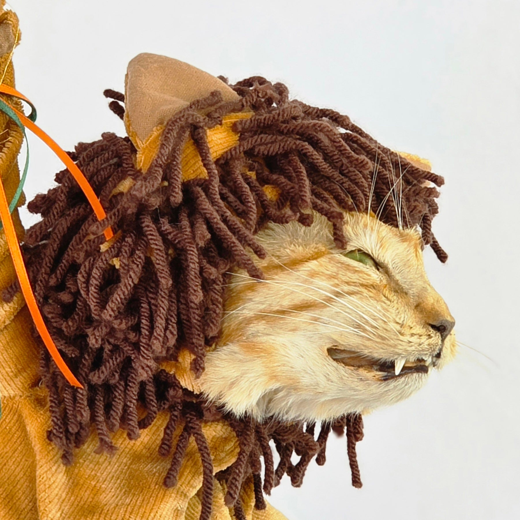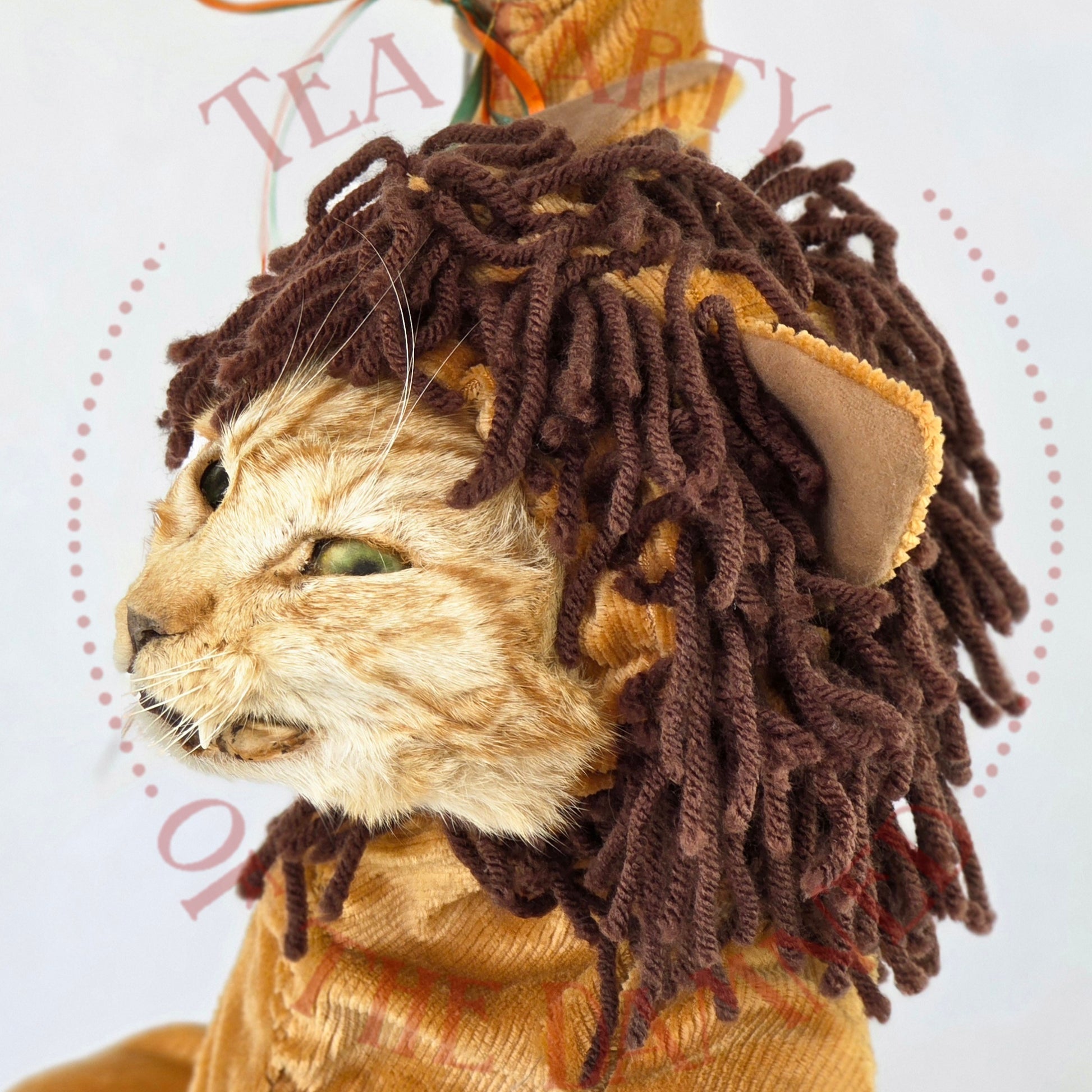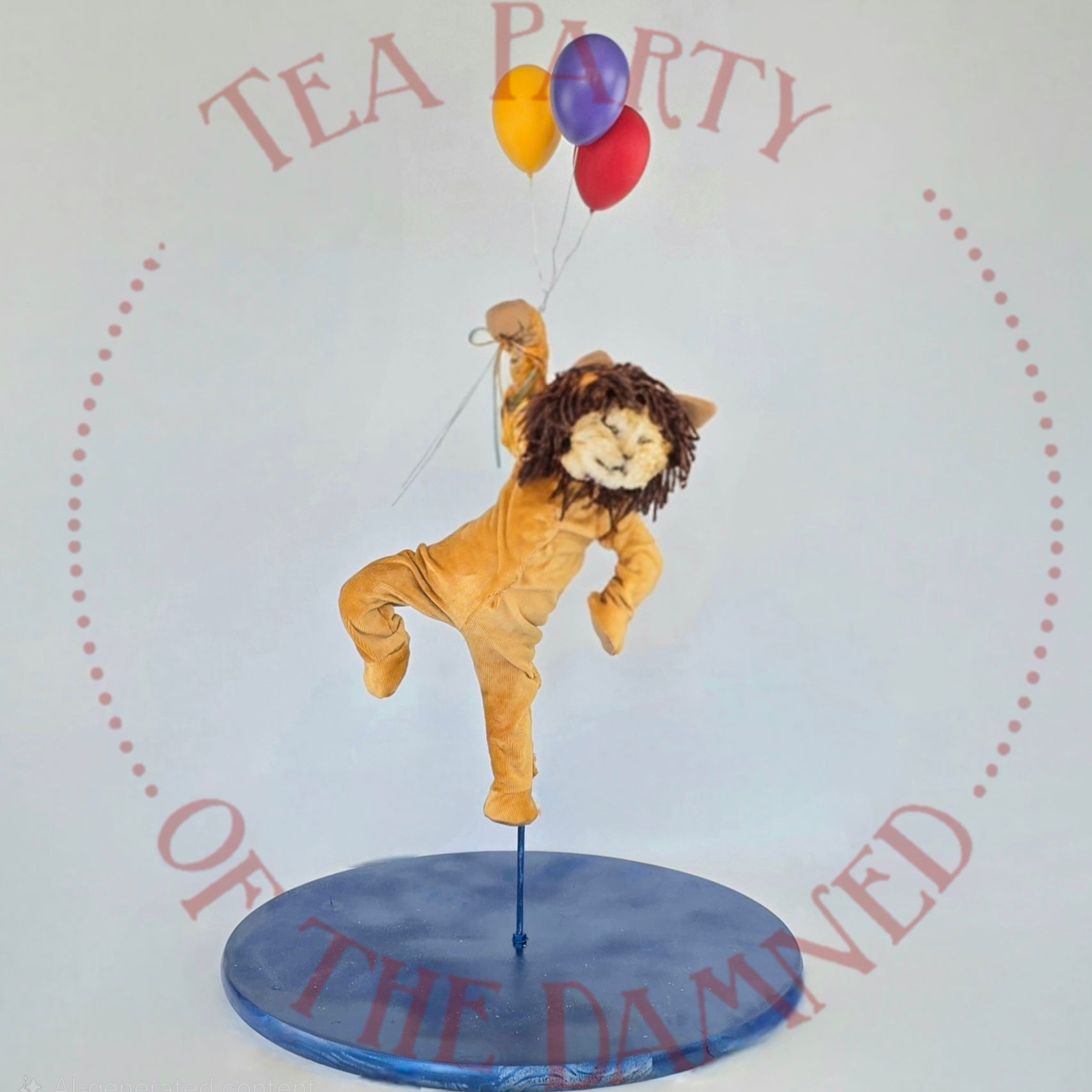 Dressed in a plush feline suit and suspended in mid-air like a furry acrobat who’s late for his own spotlight, he brings a touch of vintage circus charm to any room—minus the popcorn smell.
