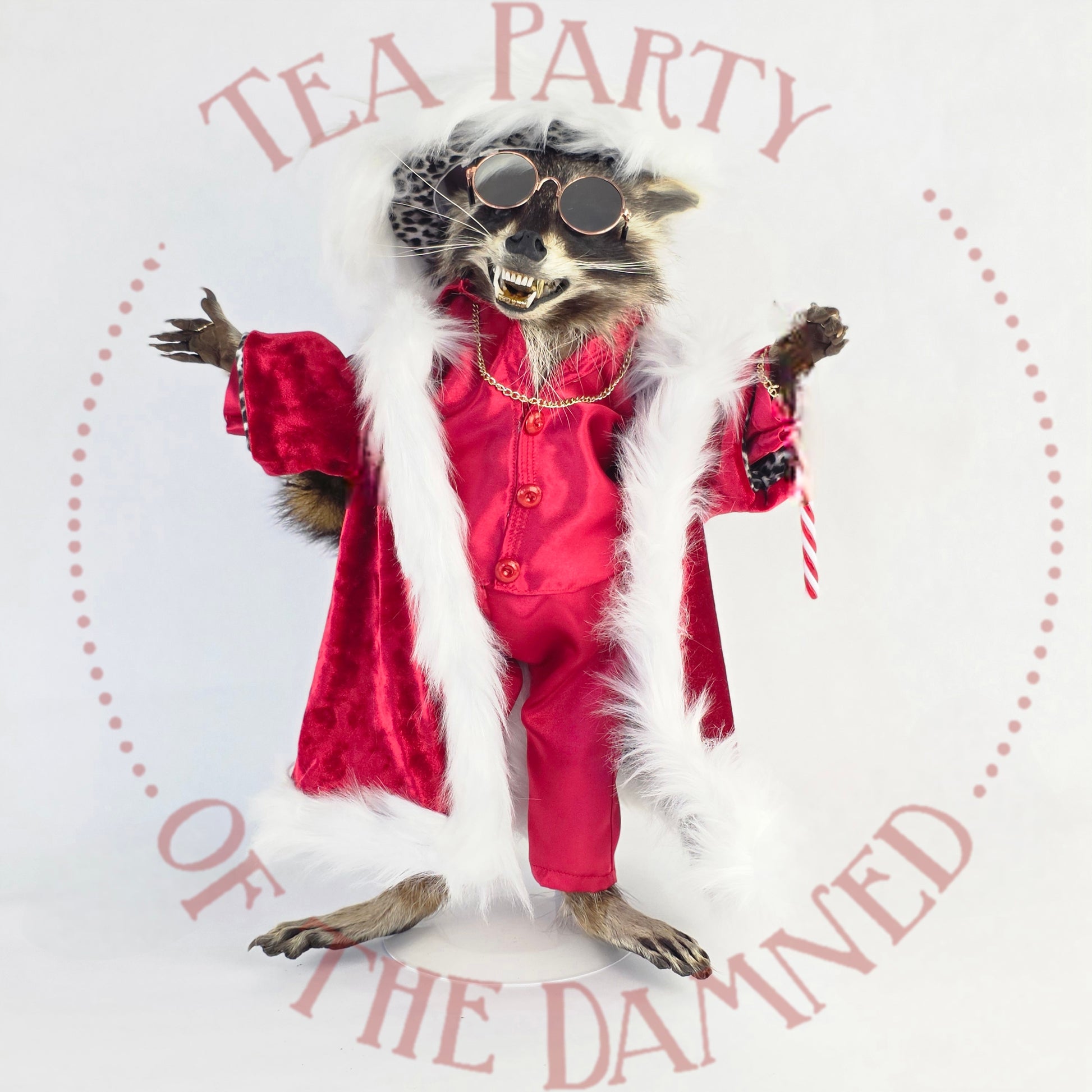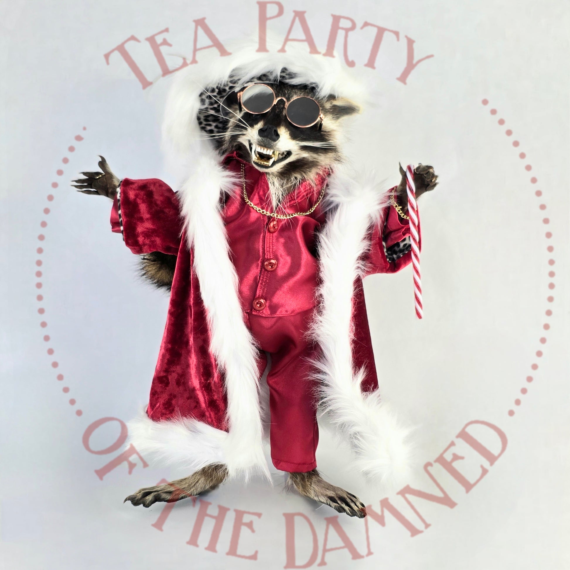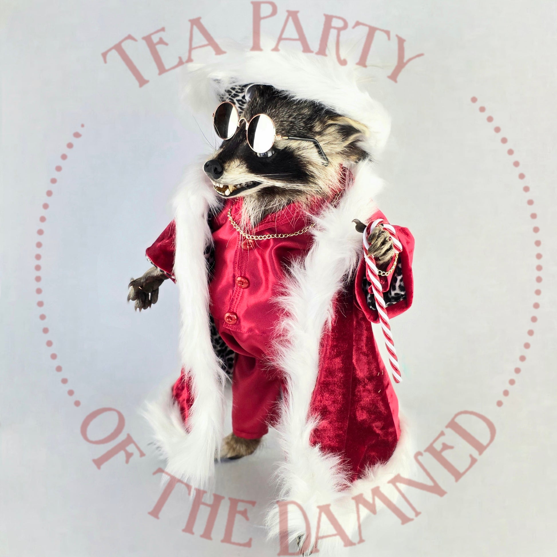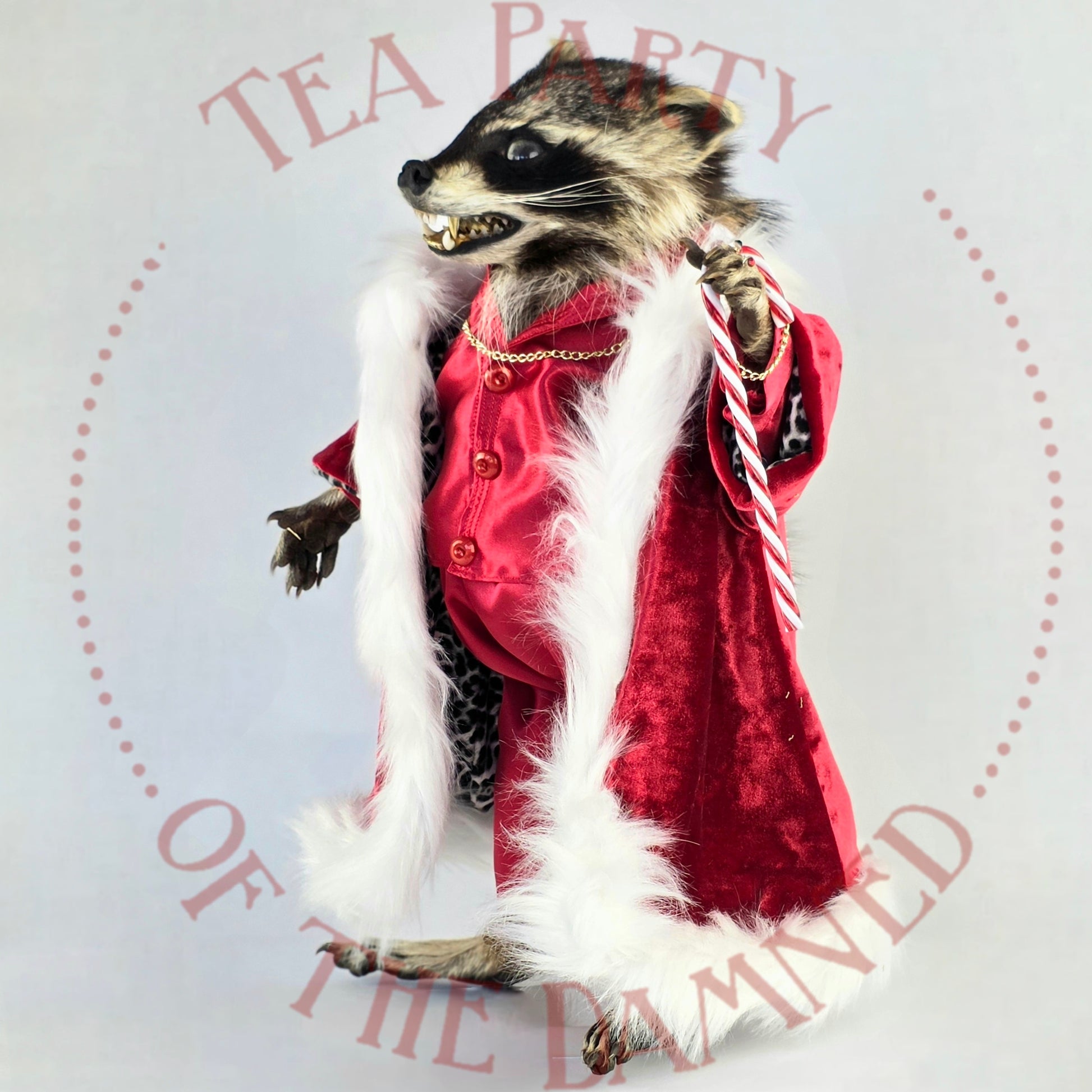 Wrapped in scandalous red satin, dripping in faux-fur authority, and armed with a candy cane that ain't compensatin' for nuthin', this rakish raccoon is here to sleigh… in every sense.