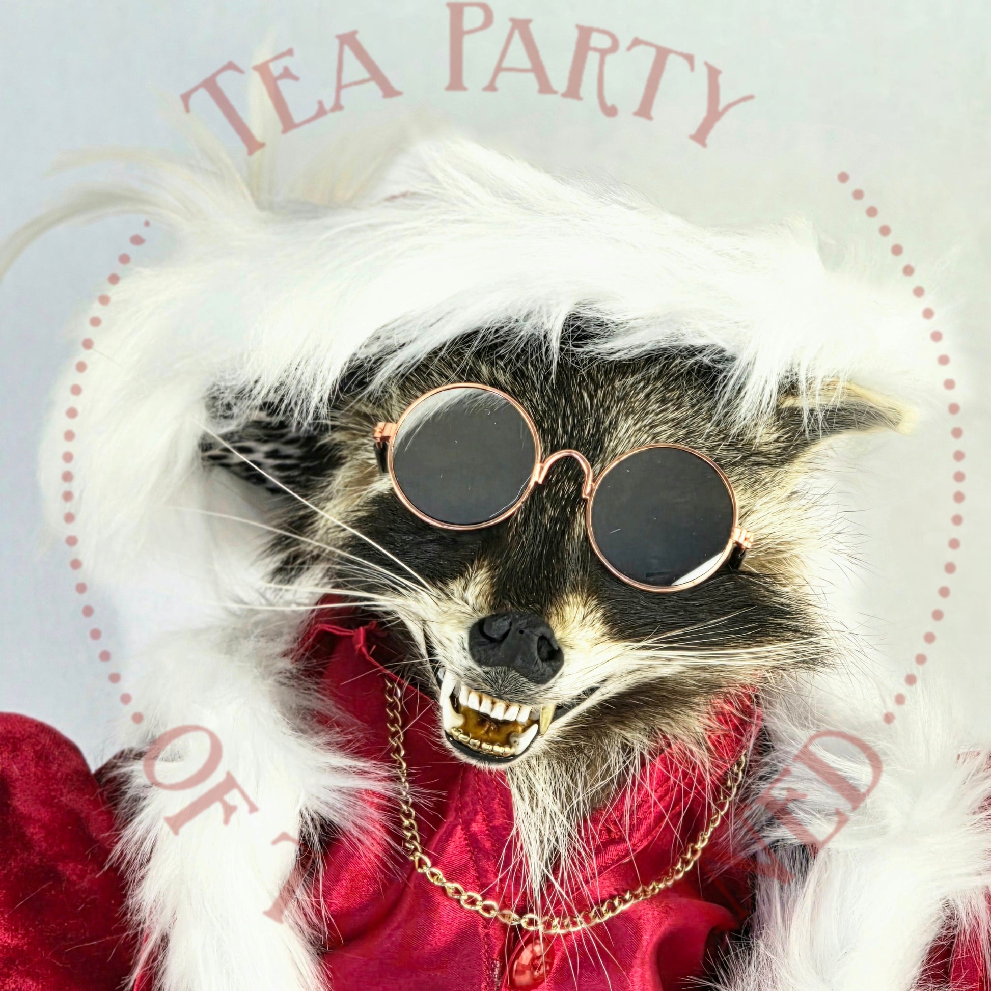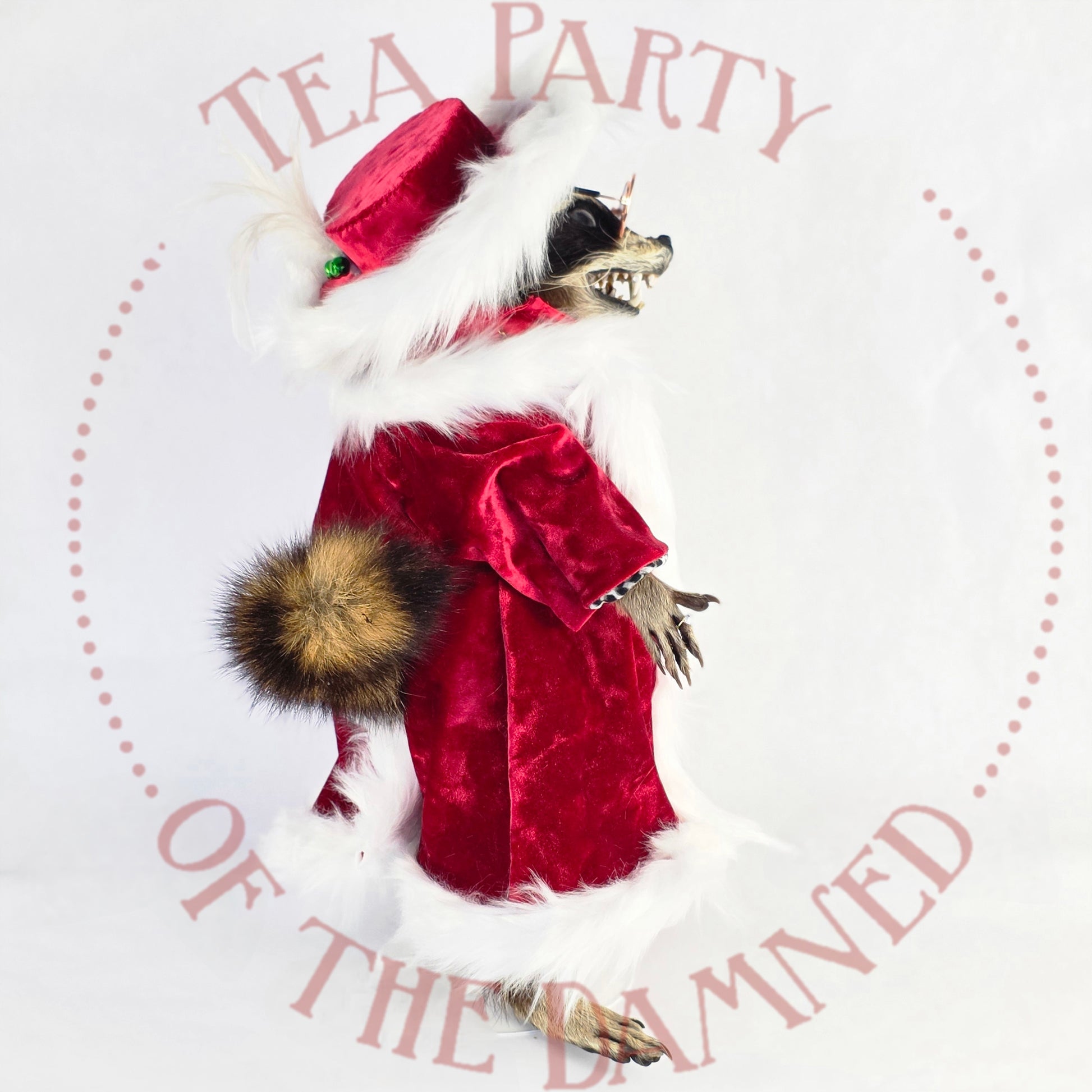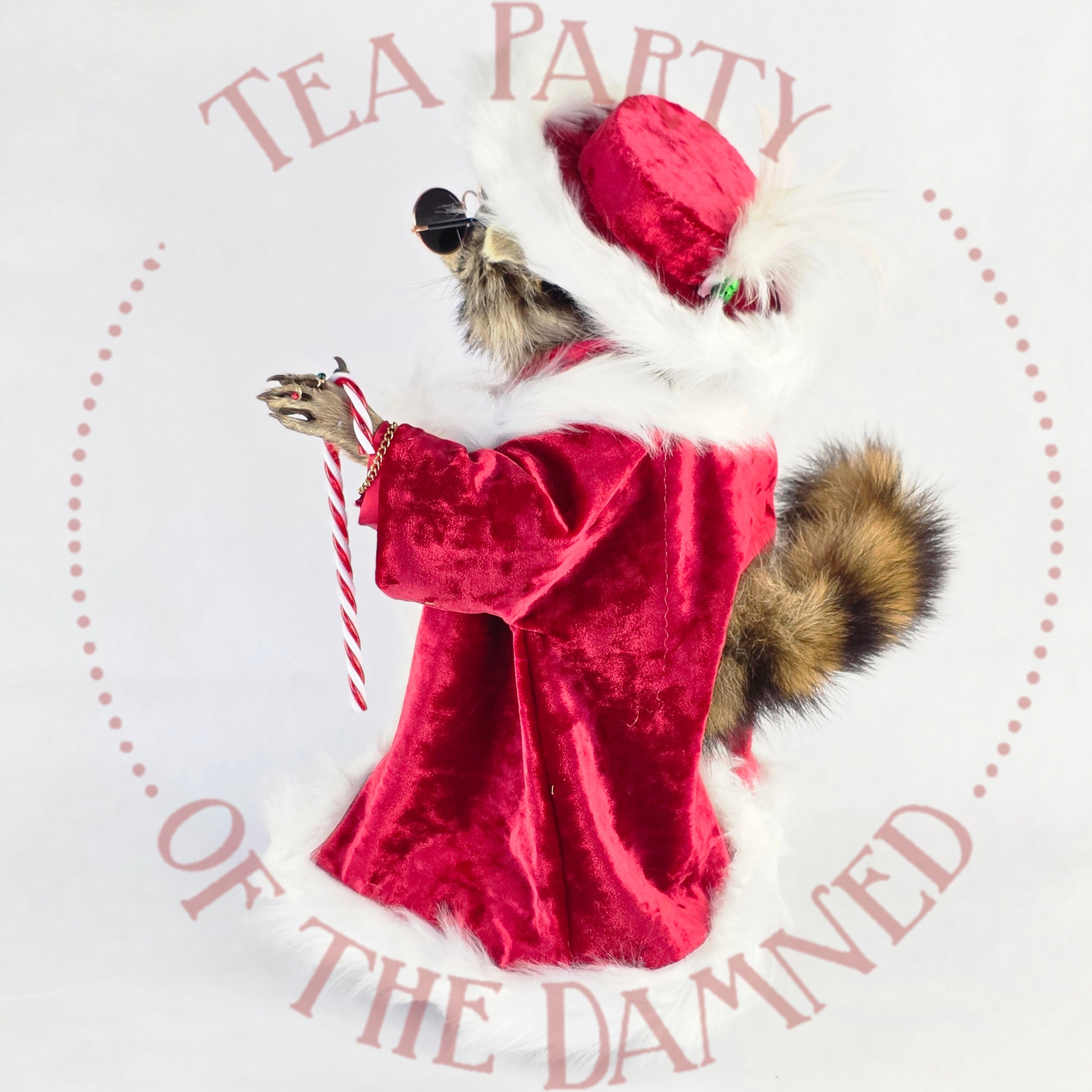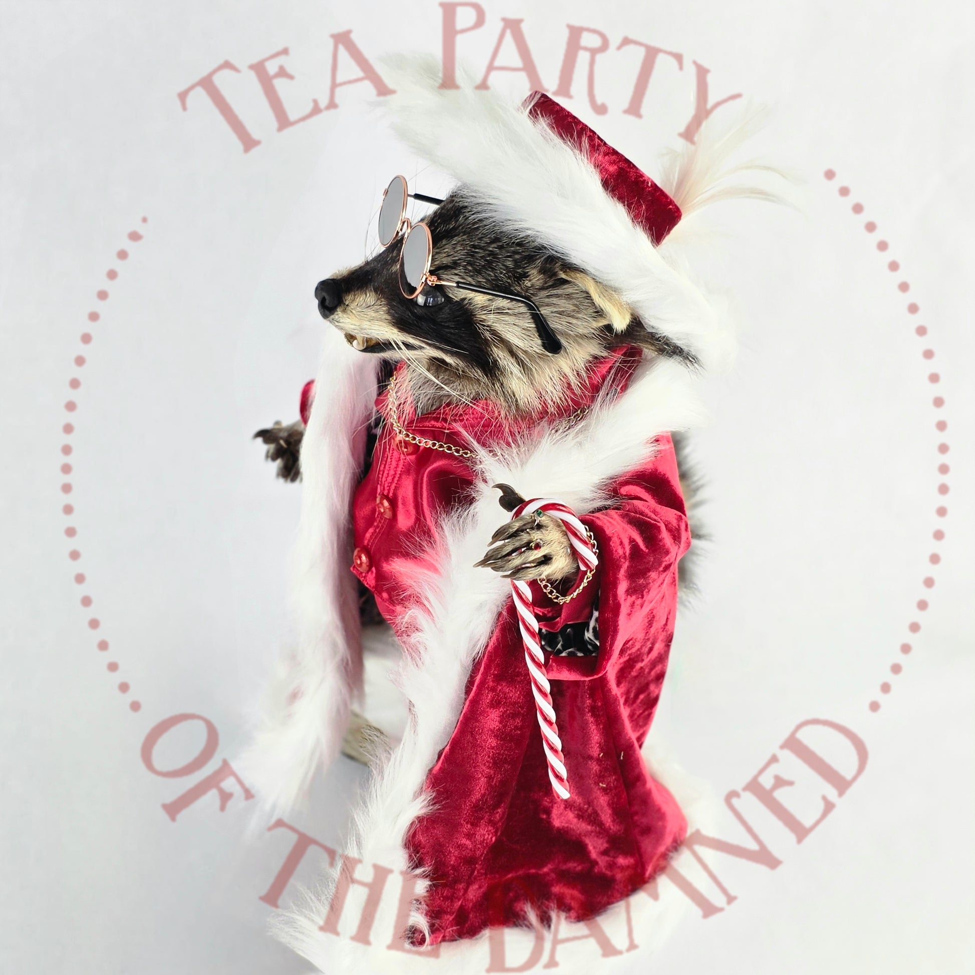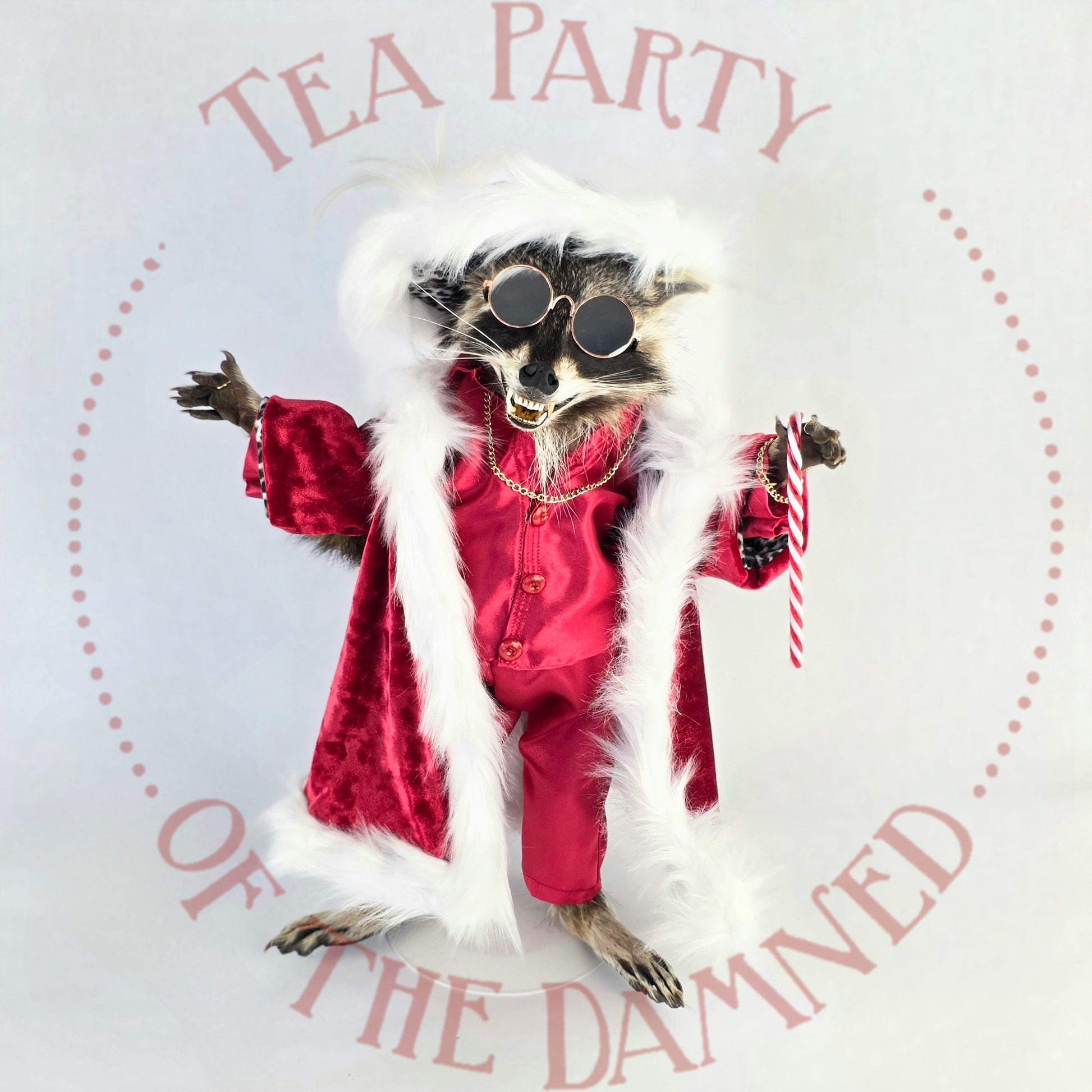 Wrapped in scandalous red satin, dripping in faux-fur authority, and armed with a candy cane that ain't compensatin' for nuthin', this rakish raccoon is here to sleigh… in every sense.